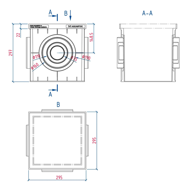 Универсальный дождеприемник без наполнения! Габариты 300x300 мм, высота 297 мм. Имеет выходы для подключения труб ØØ 75, 110, 160 мм. Дождеприемники могут устанавливаться друг на друга для укладки водоотводной трубы ниже глубины промерзания. Несколько дождеприемников могут использоваться как самостоятельный дренажный колодец. Подходит для приусадебных участков, садовых и парковых зон (класс нагрузки до B125 — до 12,5 т./м²). Водоприемная решетка (при сборе воды с крыши), крышка (если используется как дренажный колодец), корзина для сбора мусора и перегородки приобретаются отдельно!