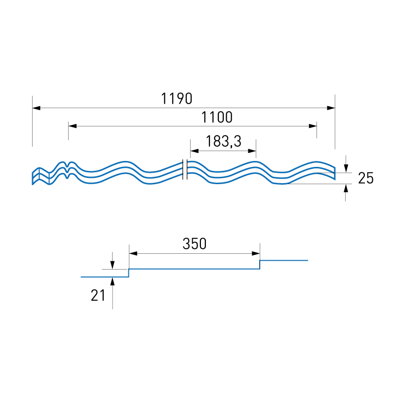 Для изготовления основы применяется металл толщиной 0,5 мм. Покрытие — Полиэстер (PE) цвета RAL7024. Формат поставки: в листах, стандартные длины. Длина — 2220 мм. Профиль — Бегущая волна высотой 46 мм.