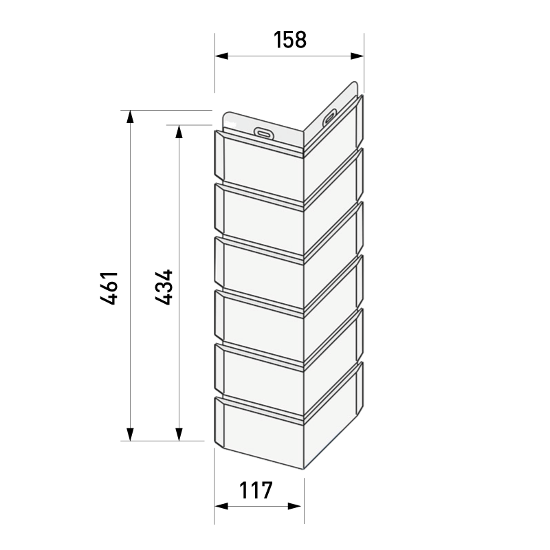 Внешний угол для фасадной панели под фактурный кирпич с контрастными швами Docke BERG длиной 434 мм. Предназначен для оформления наружных углов и отдельных архитектурных элементов фасада. Скрывает места угловых стыков фасадных панелей, защищает от проникновения влаги. Производятся углы из полипропилена и идентичны по структуре и цвету фасадным панелям Docke BERG.